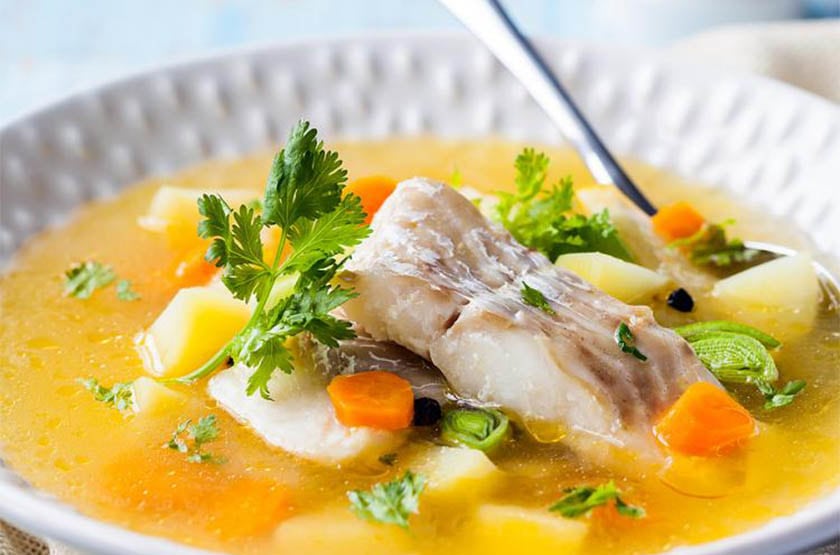 Μόλις βράσουν προσθέτουμε το ψάρι, το ελαιόλαδο, το αλάτι, το πιπέρι και τα φύλλα δάφνης.