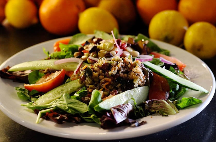 Σε ένα μπολ για σαλάτα ανακατεύουμε όλα τα λαχανικά και στο τέλος, αφού έχουμε αφήσει να κρυώσουν πρώτα, ρίχνουμε την τρίχρωμη κινόα με τις κόκκινες φακές.