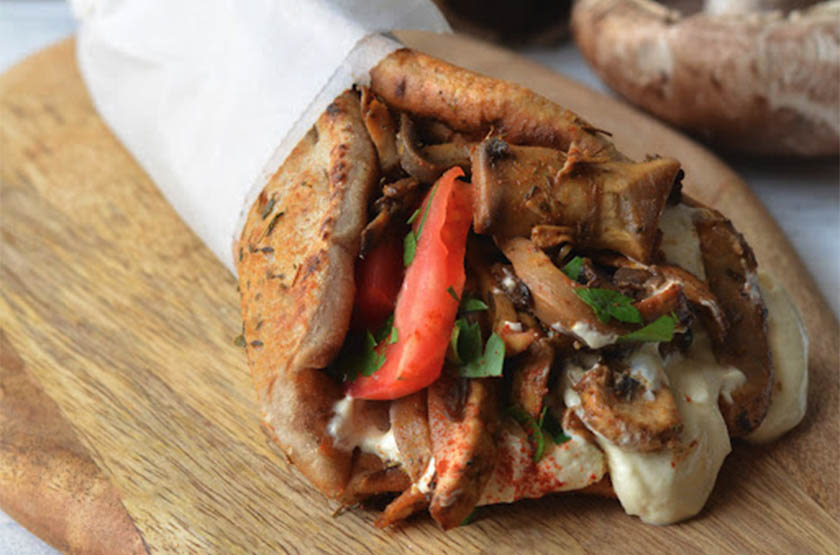 Όταν τελειώσει το ψήσιμο στη βάση της πίτας στρώνουμε το χούμους, μετά τον γύρο μανιταριών, ροδέλες από τομάτα και κρεμμύδι, το μαρούλι, πάπρικα γλυκιά ή καυτή (ανάλογα πόσο πικάντικο θέλουμε το σουβλάκι μας) και ψιλοκομμένο μαϊντανό.